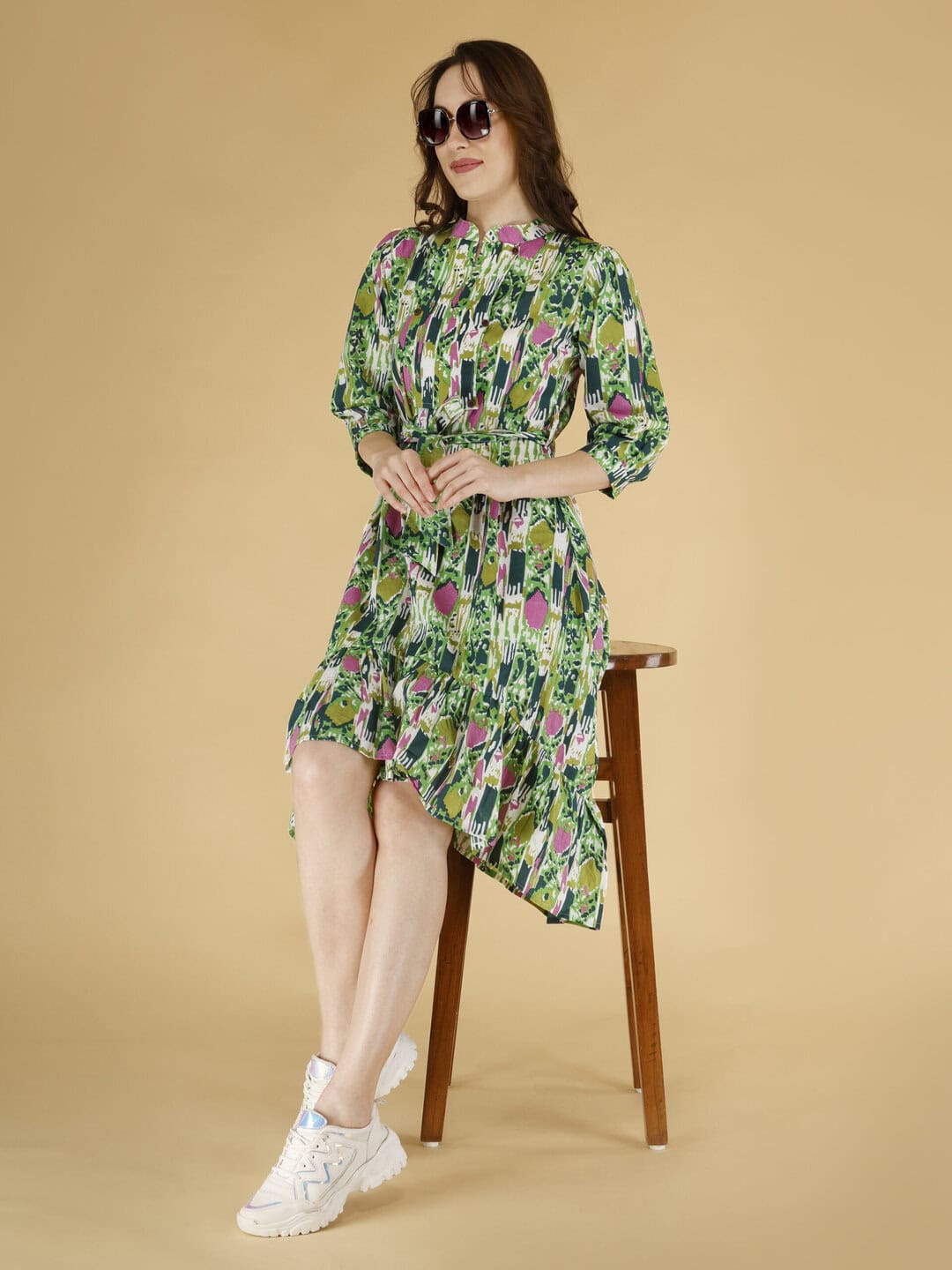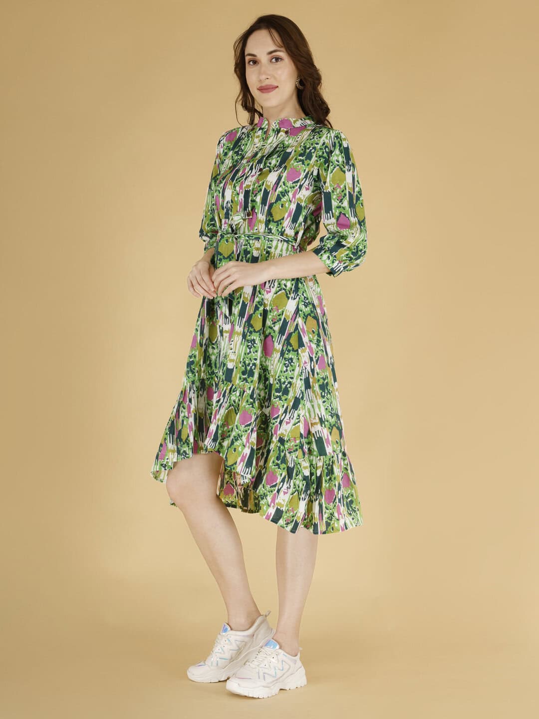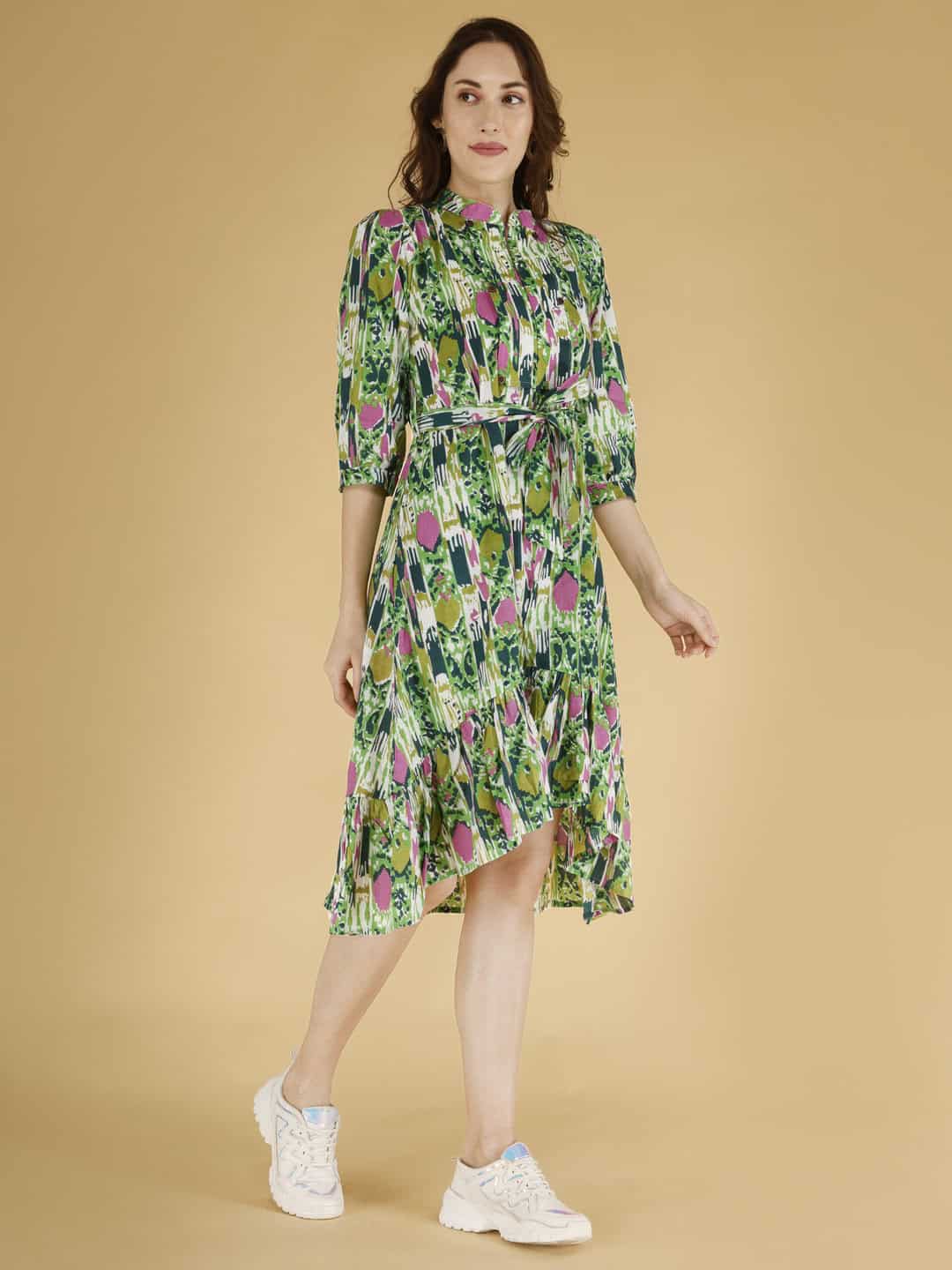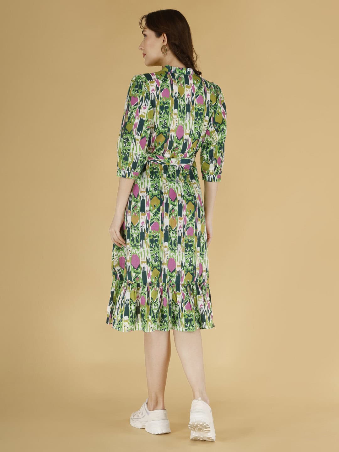 Upgrade your wardrobe with this stylish and comfortable women green printed knee length dress designed for modern everyday fashion. Featuring a vibrant abstract print in refreshing green tones, this dress adds a trendy yet elegant touch to your look.