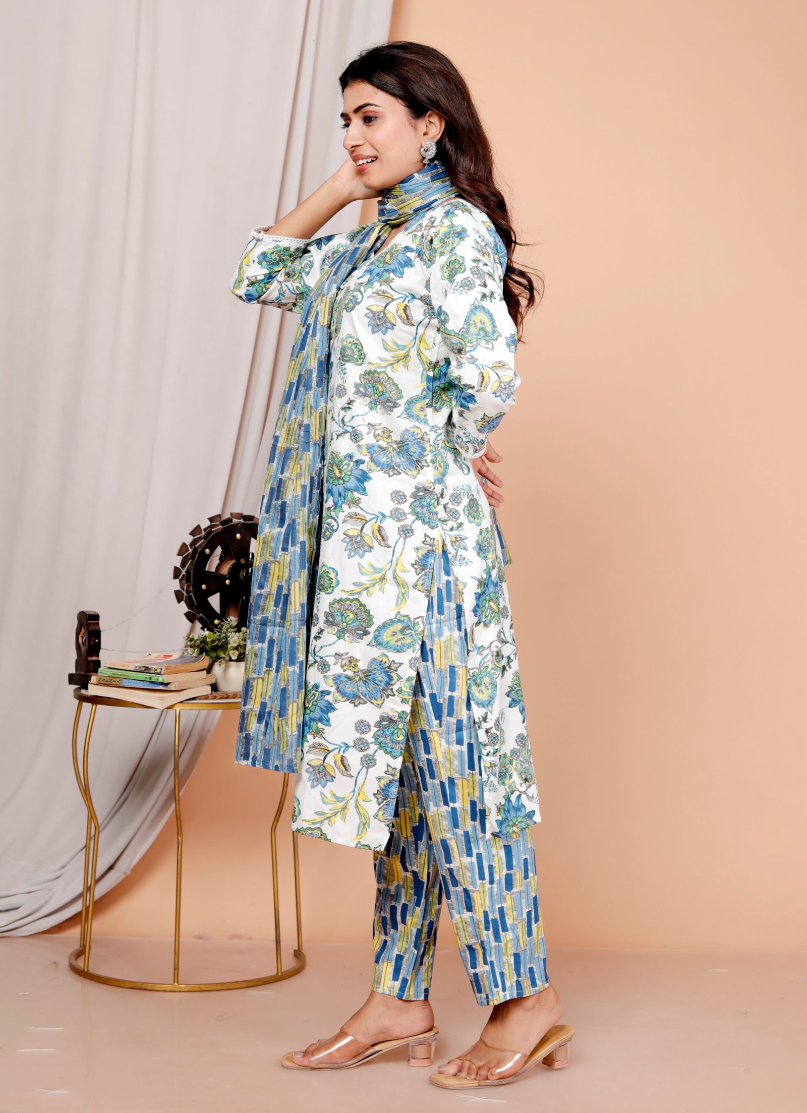 Elegant women’s blue floral printed kurta set with straight-fit kurta, coordinated pants, and matching dupatta. Perfect for daily wear, office wear, and festive styling.