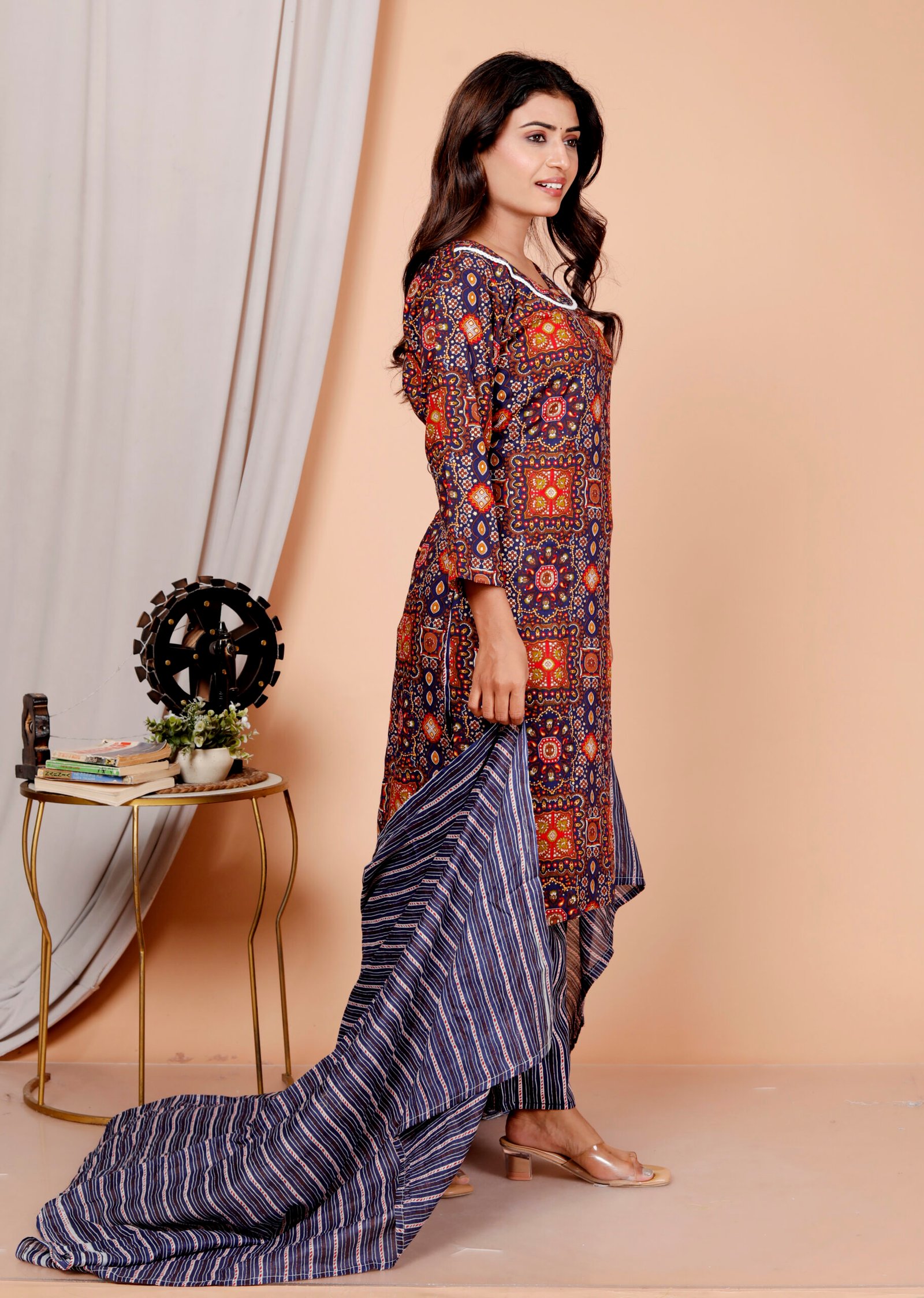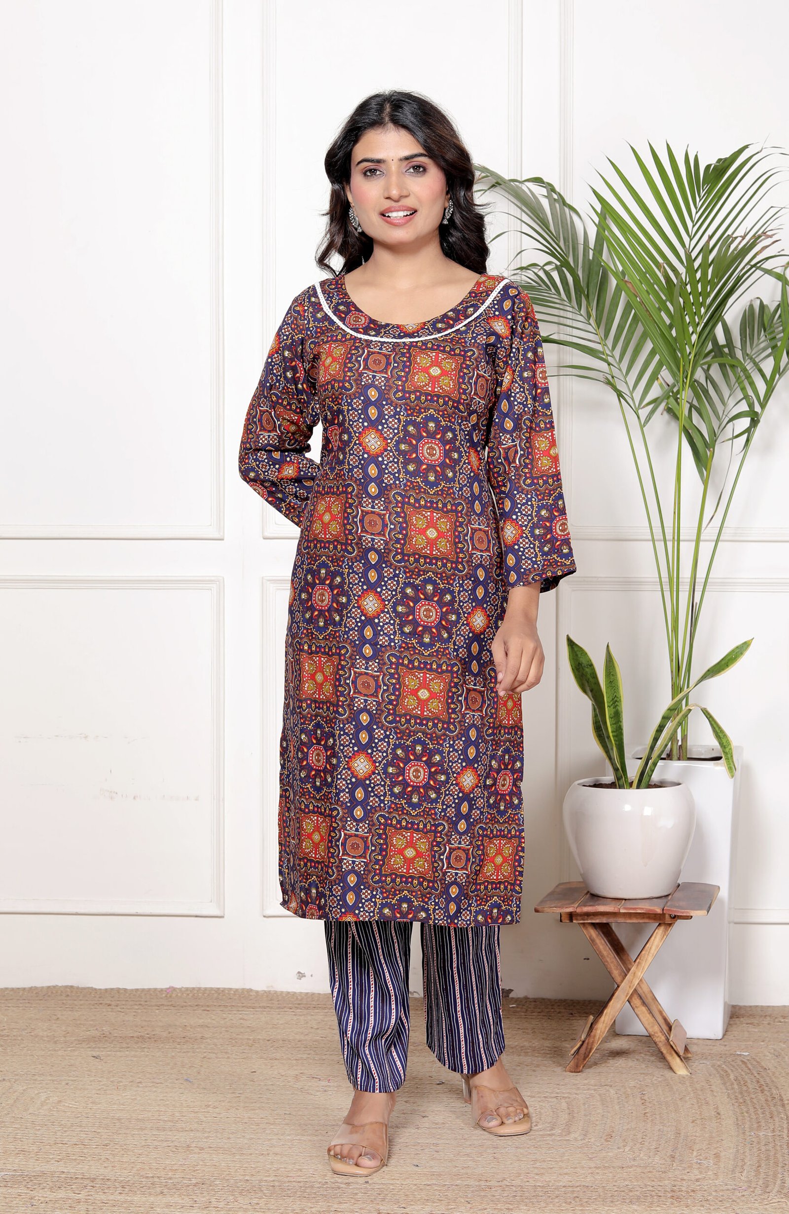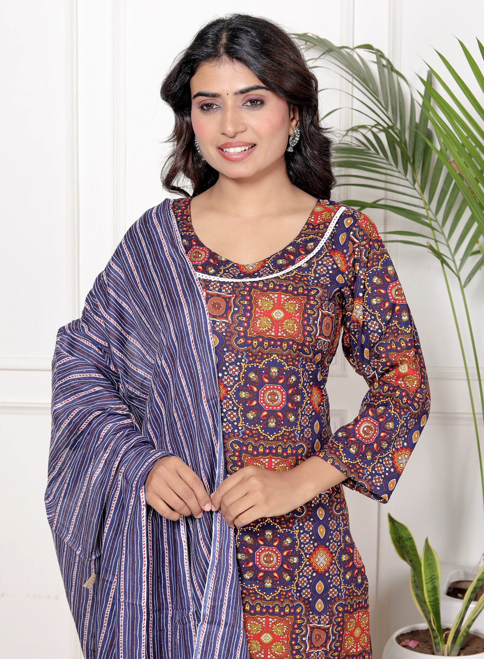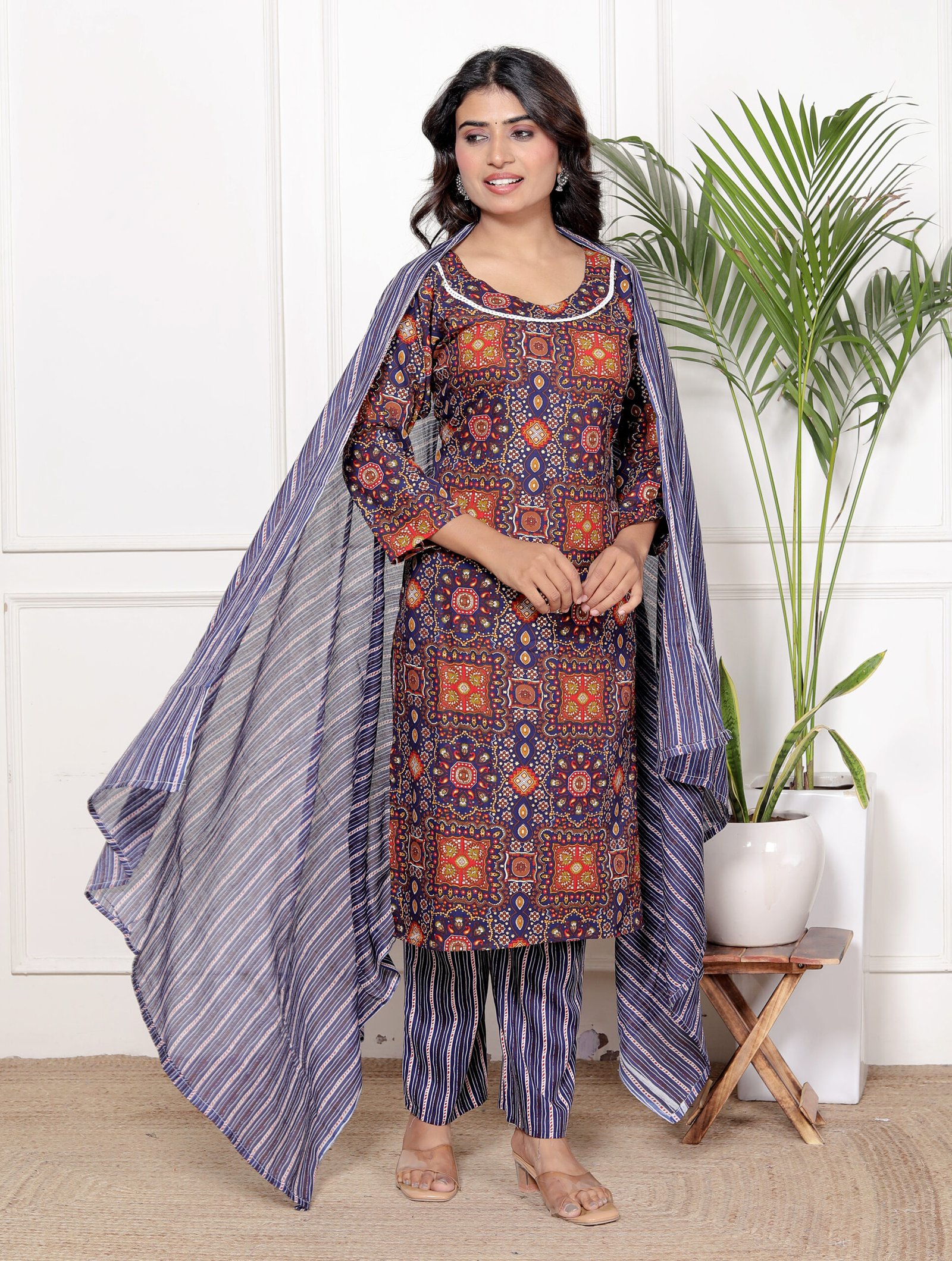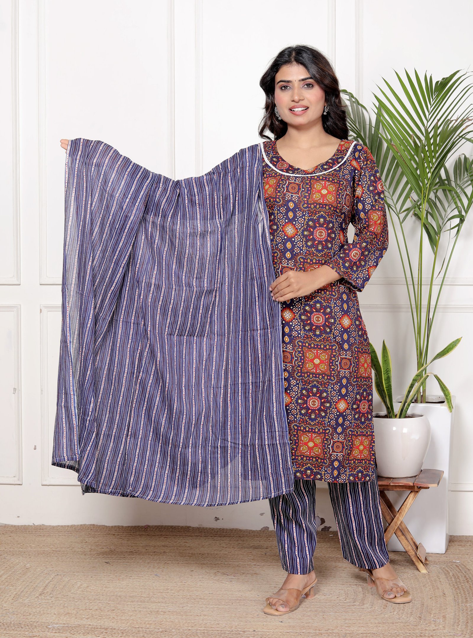 This navy blue kurta set for women is designed for modern comfort with a touch of traditional elegance. The kurta features a rich ethnic print that enhances its timeless appeal, while the matching striped pant and dupatta complete the look perfectly. This navy blue kurta set is suitable for women who prefer stylish yet comfortable ethnic wear.