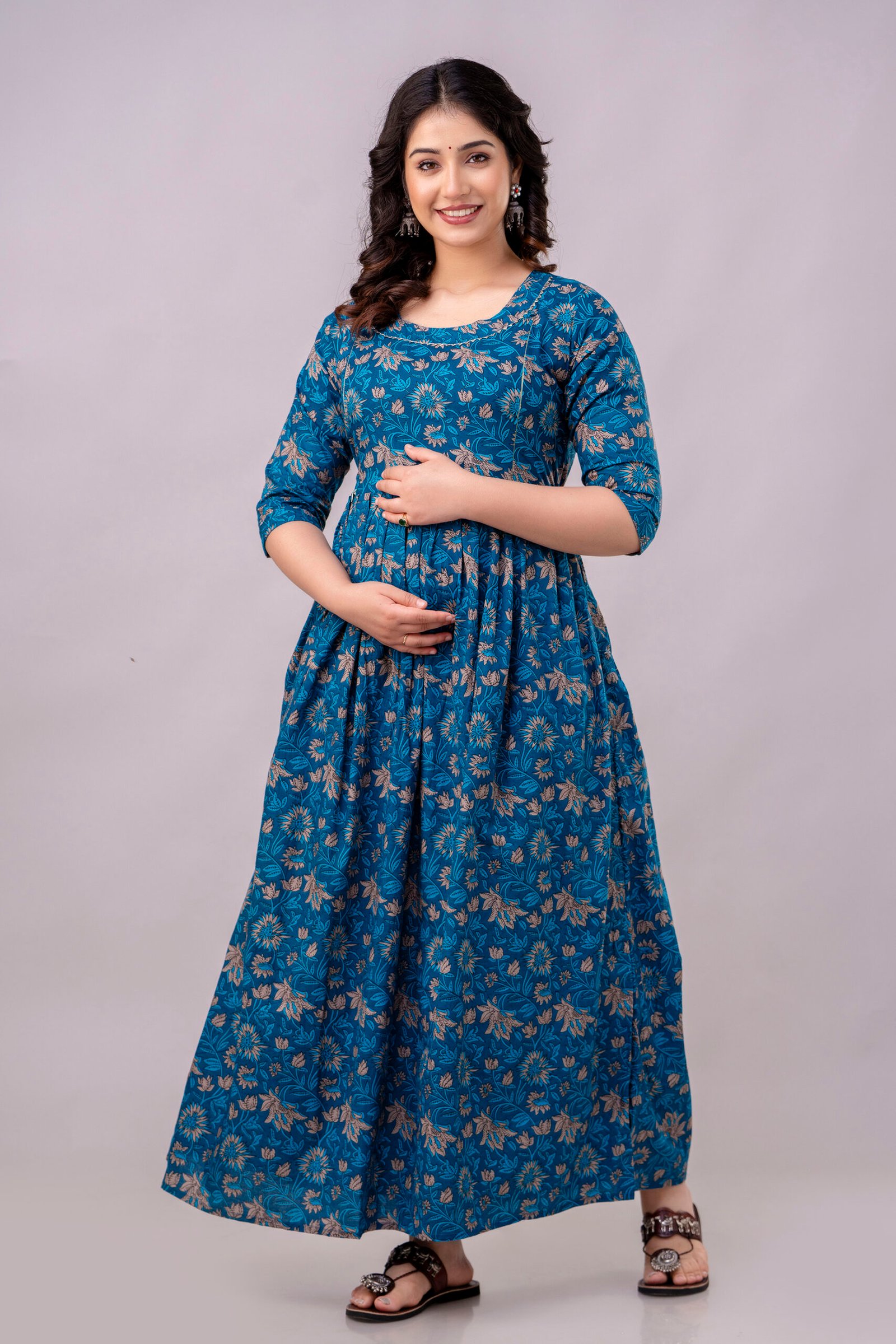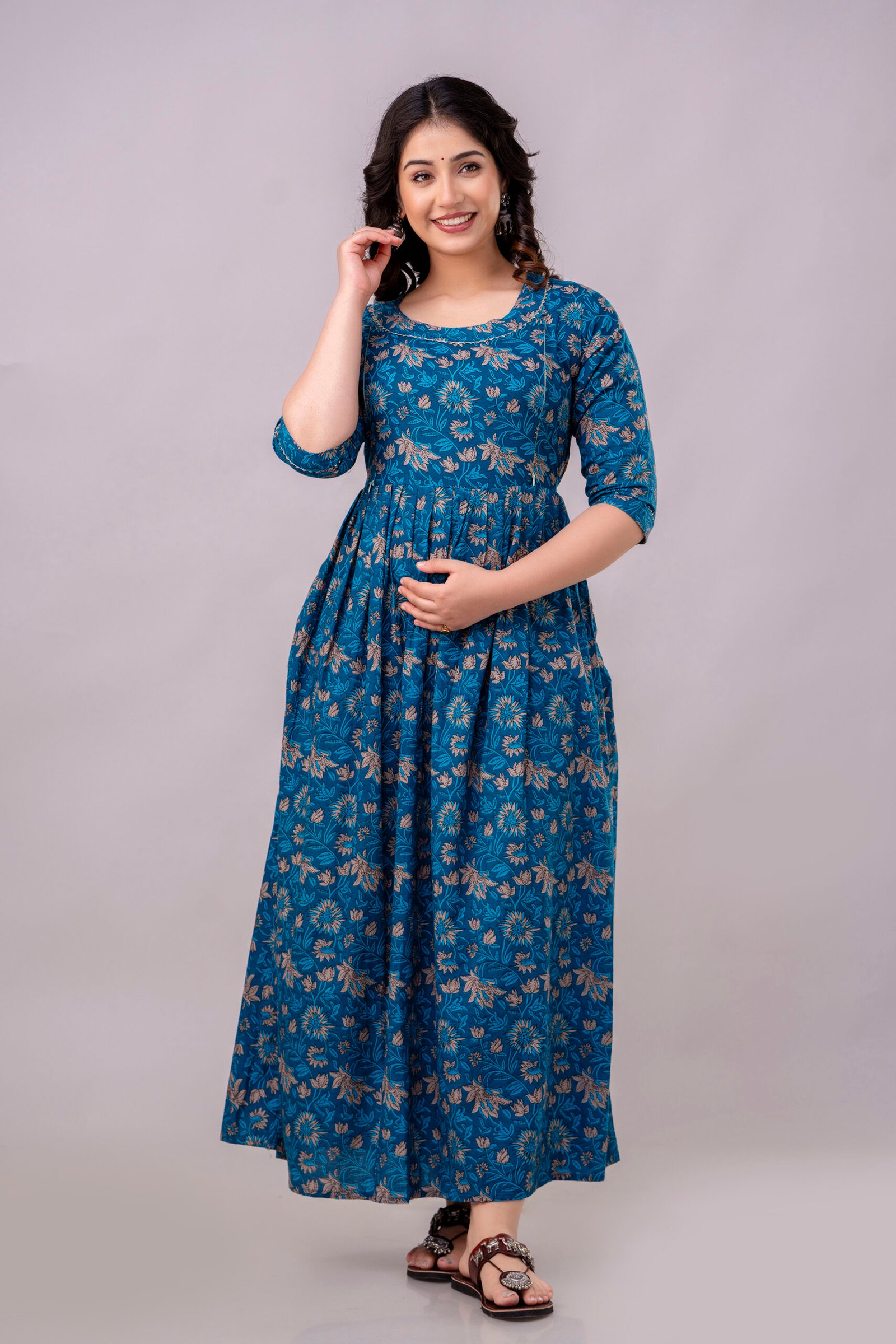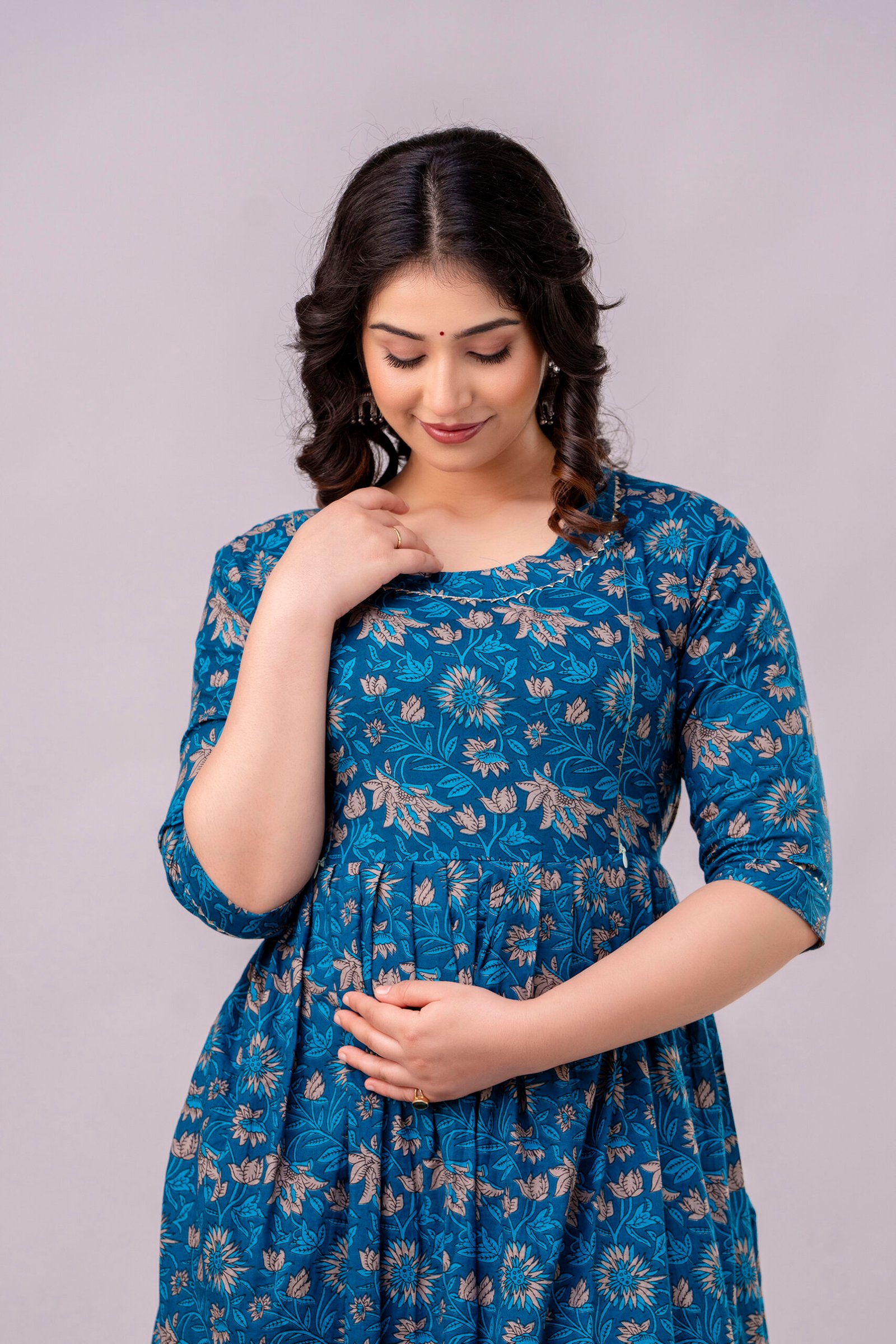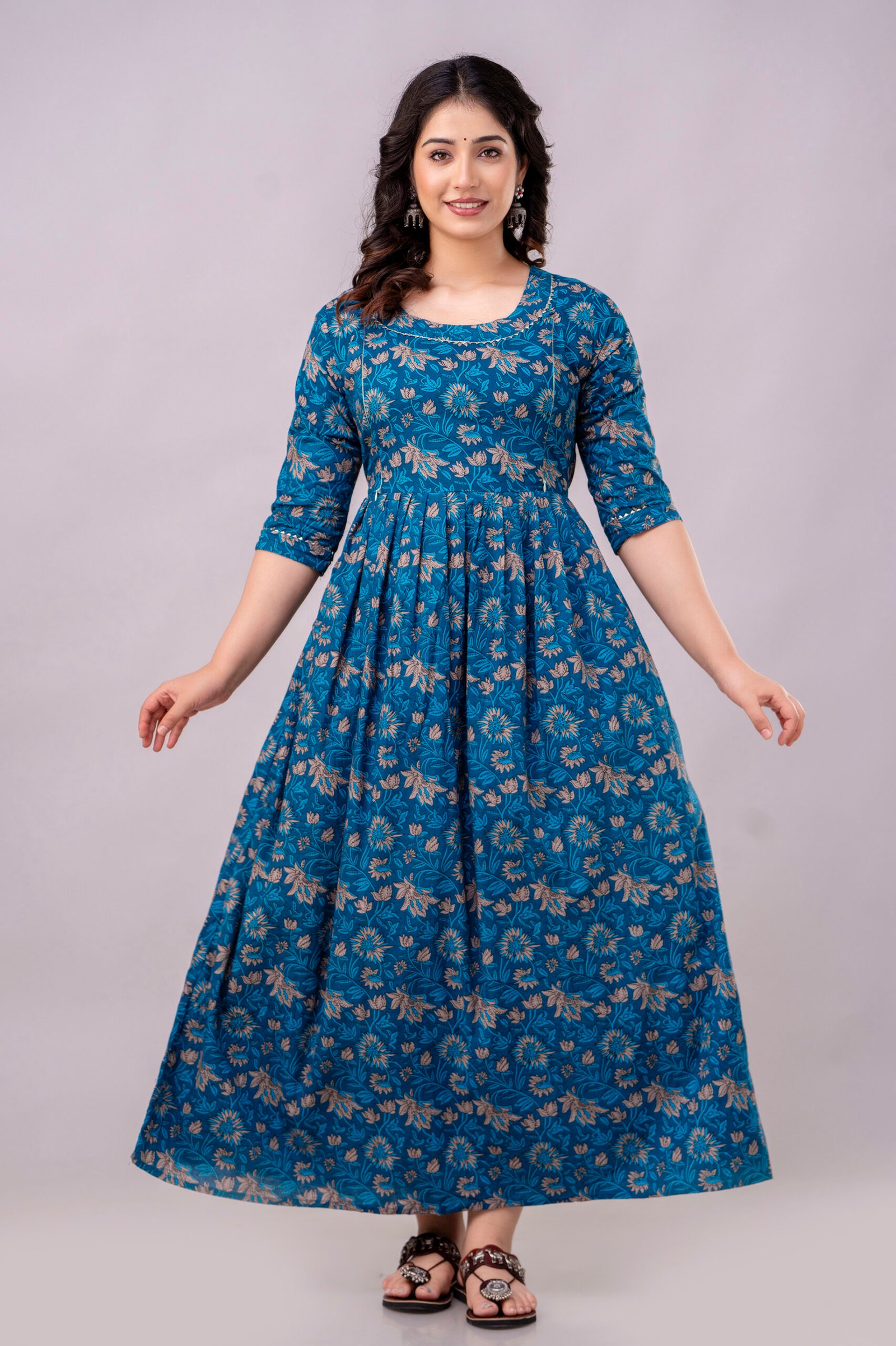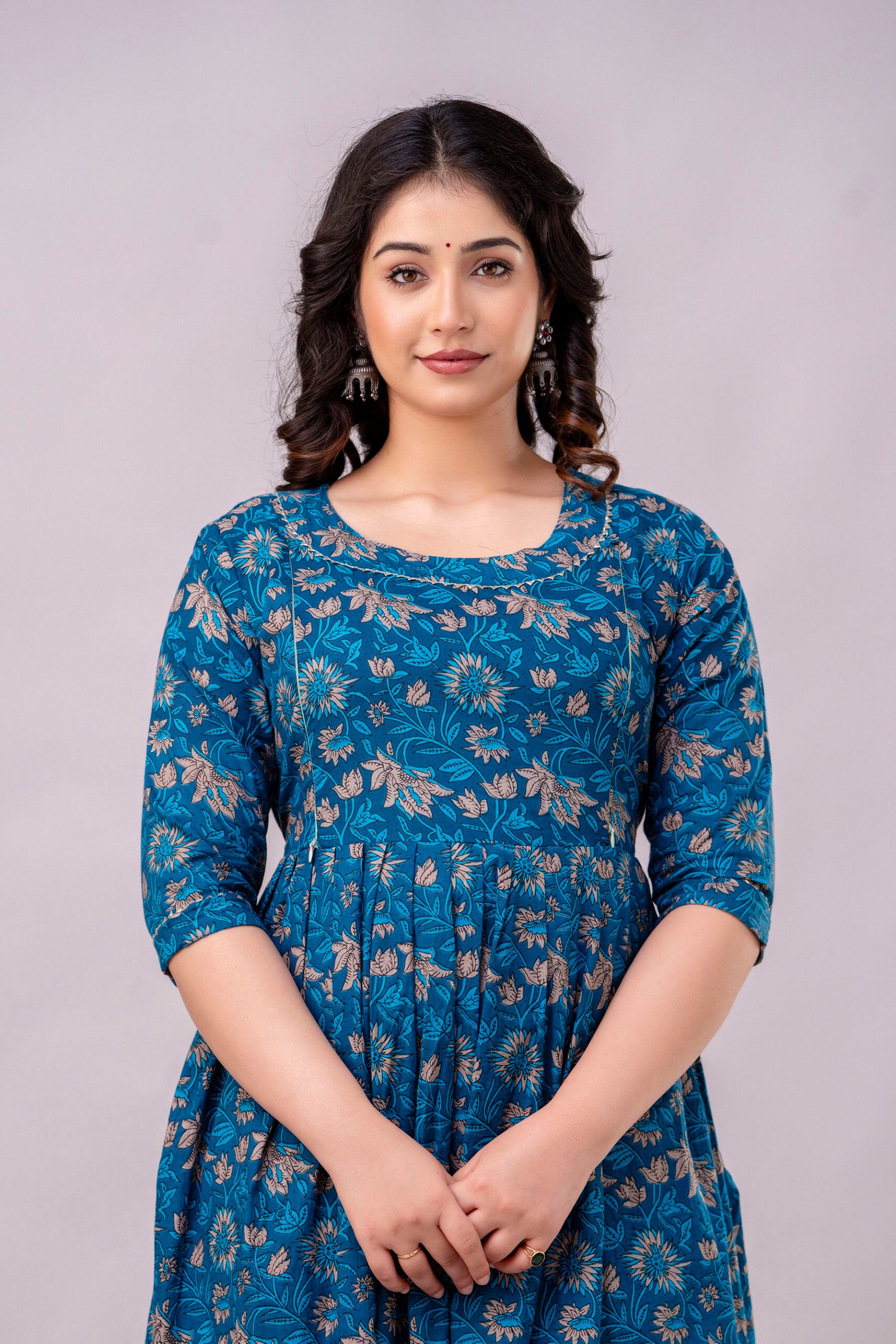Elegant women blue floral cotton kurti dress designed with a flattering A-line silhouette. Breathable cotton fabric offers lasting comfort for everyday and festive wear.
