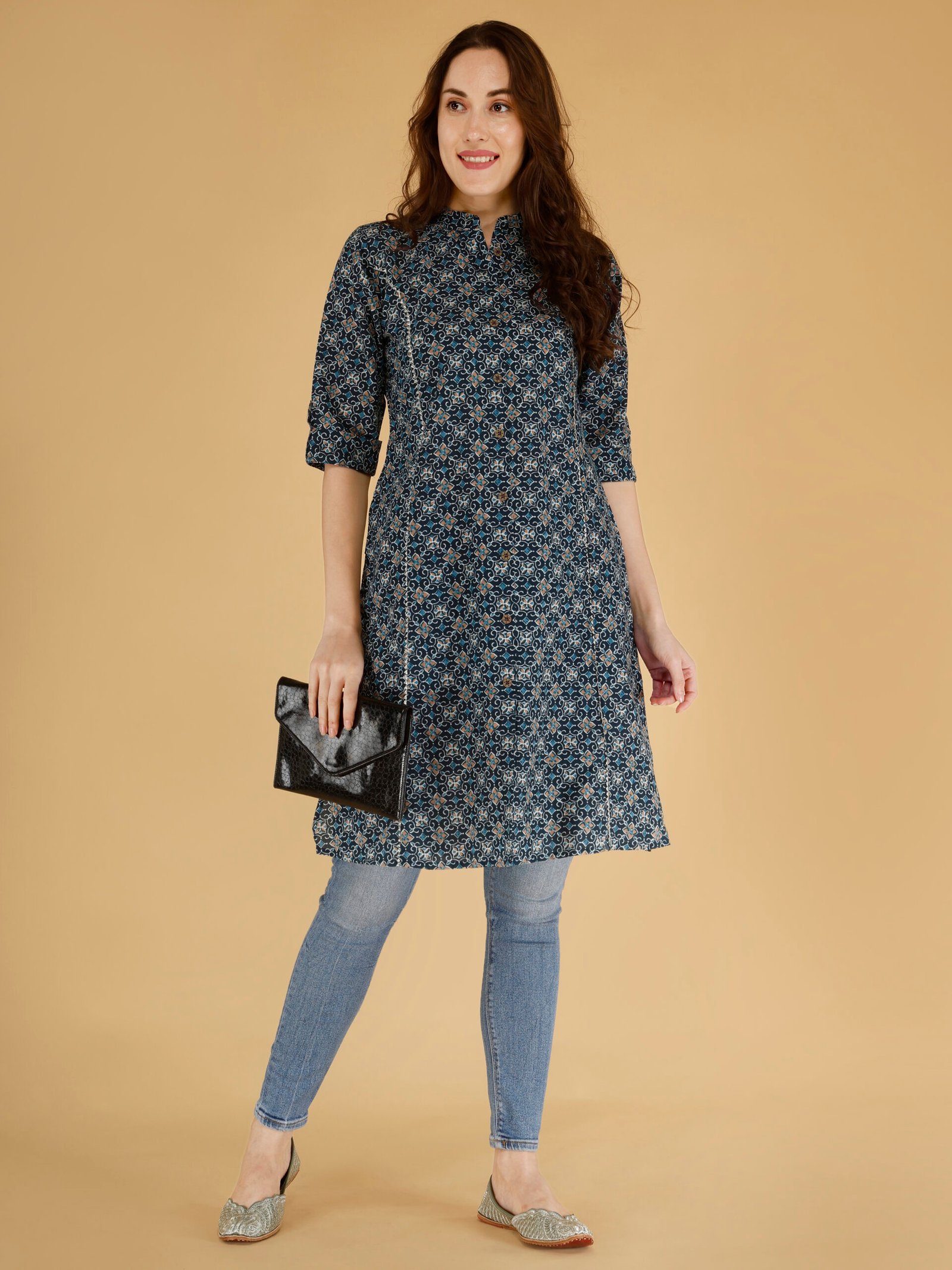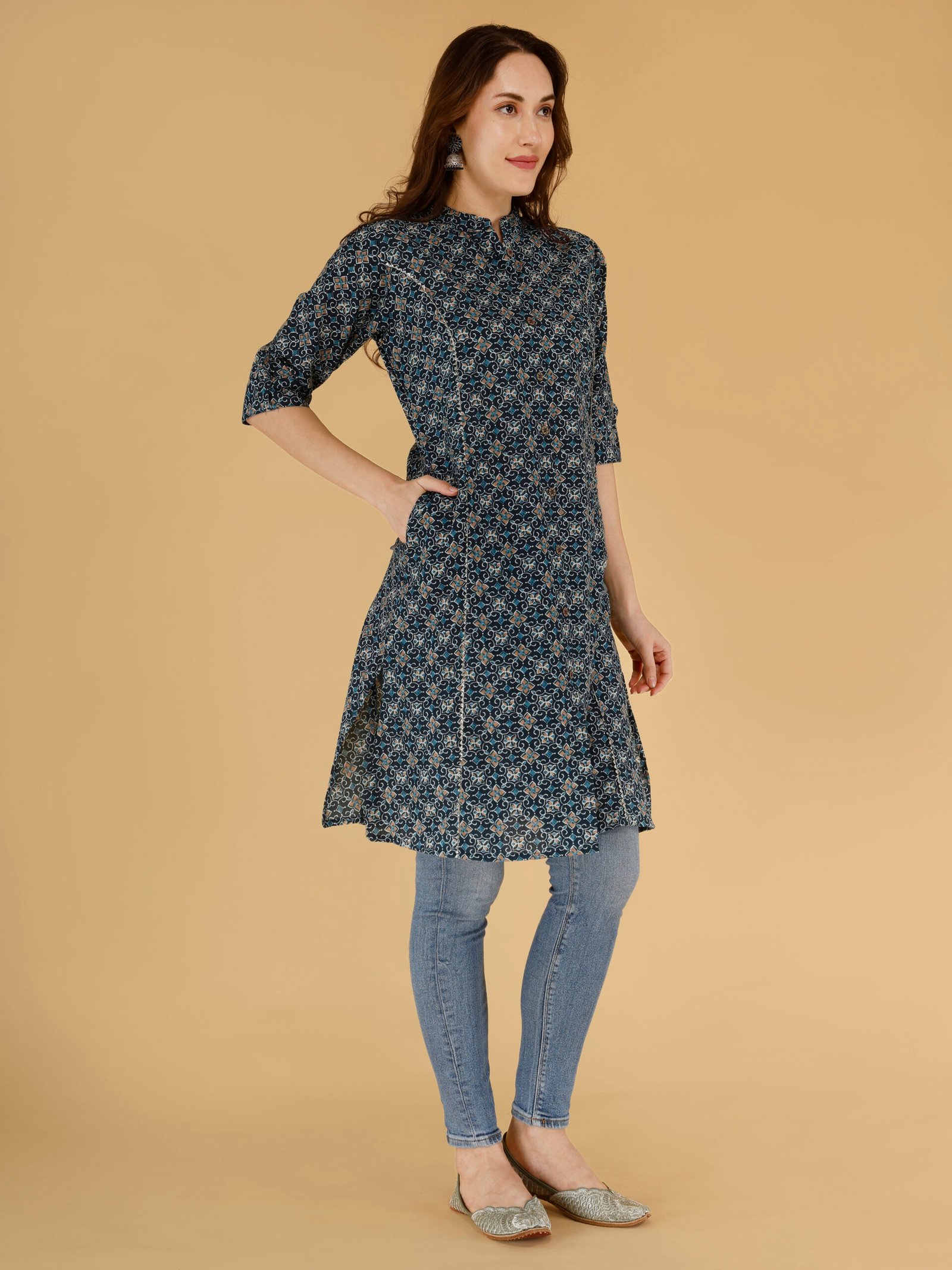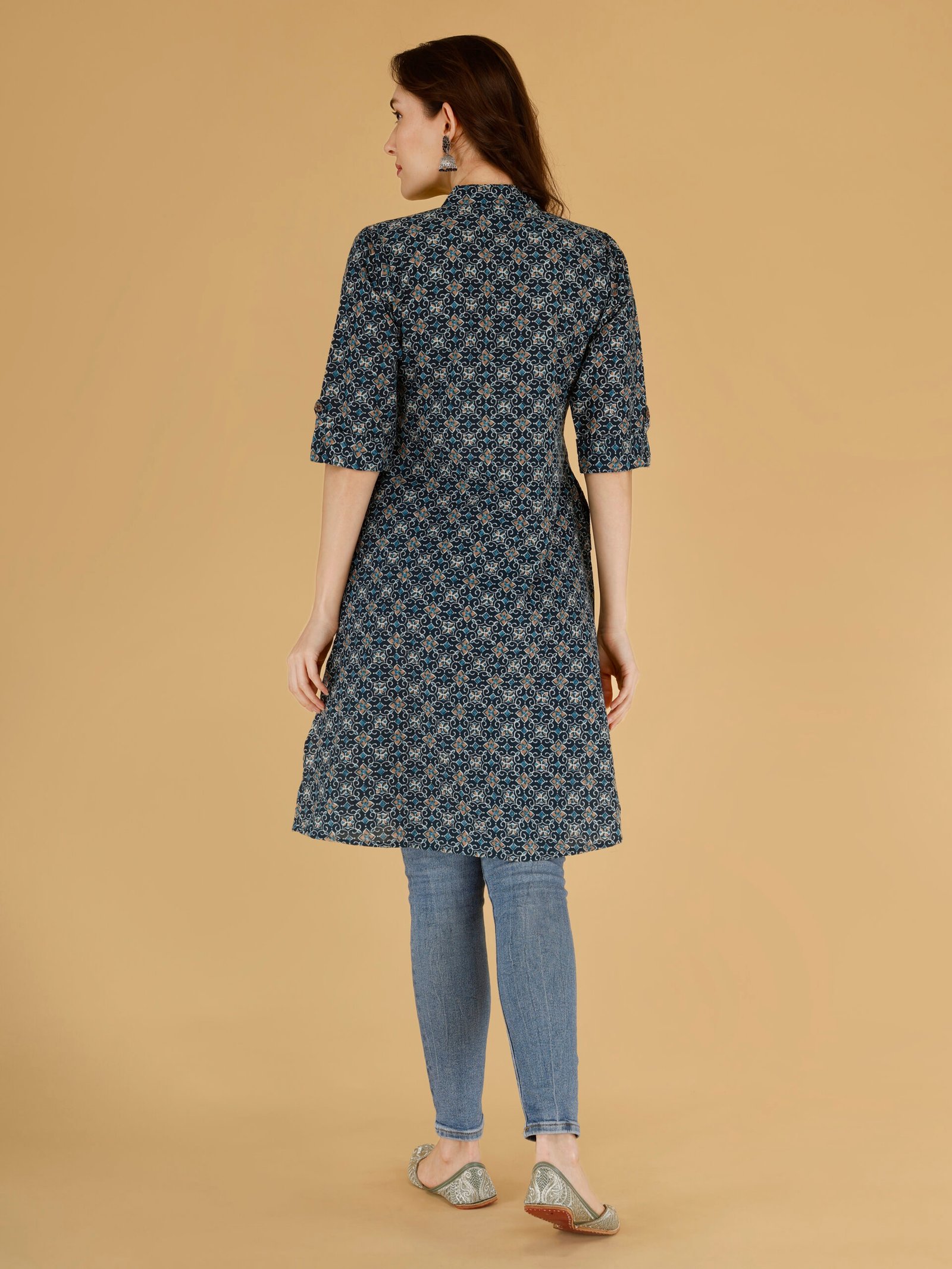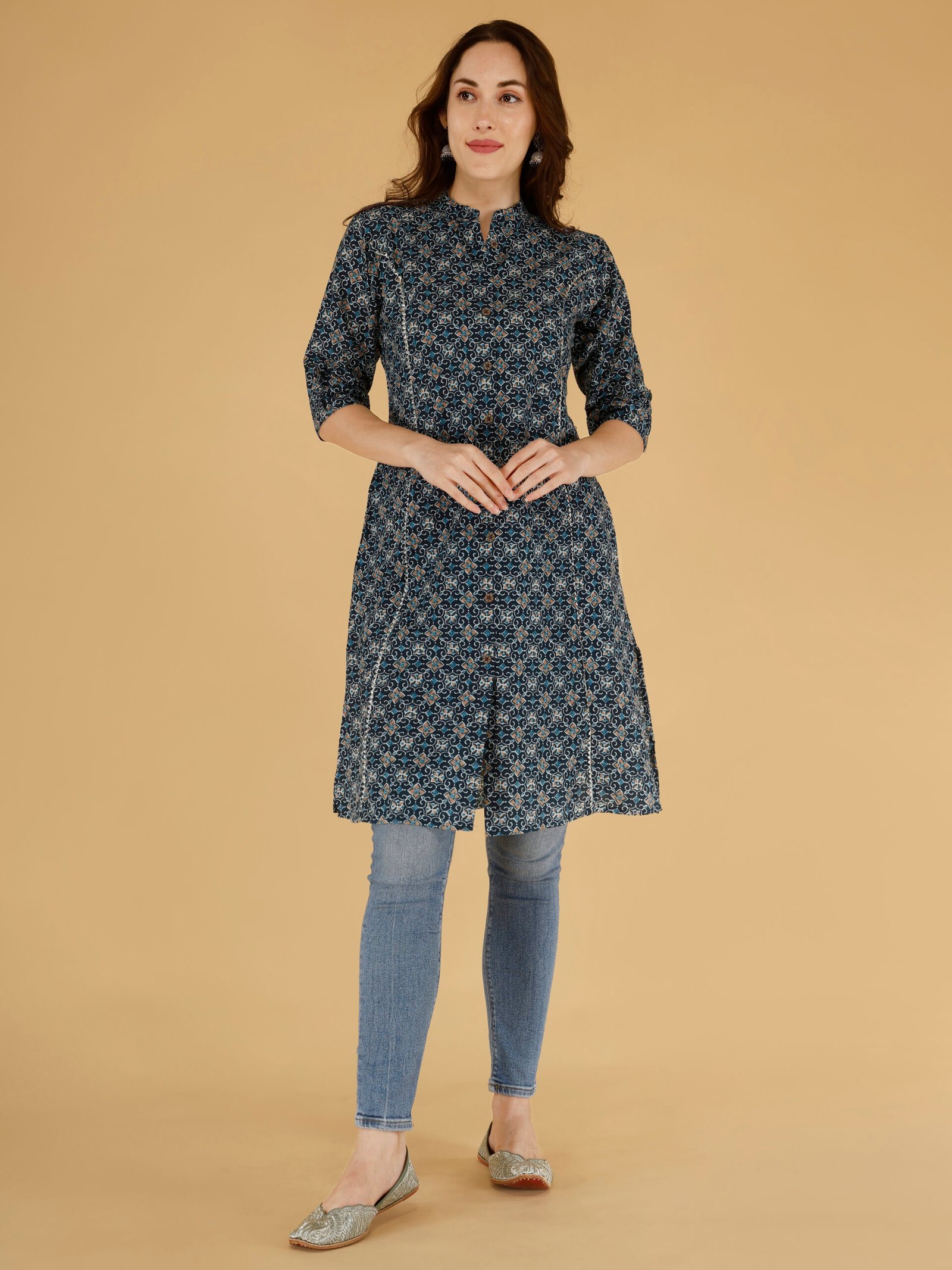 Pair this dark blue ethnic kurti for women with jeans or leggings for a chic everyday outfit. Perfect for office wear, casual styling, and festive occasions.